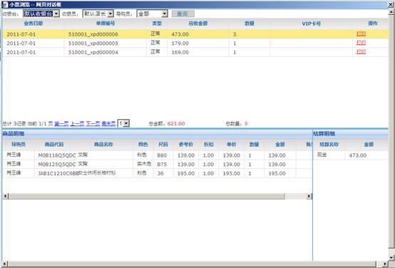 查看当天小票的总单数(红框),每单小票的明细信息(绿框),每单小票的收款情况(蓝框),小票重新打印(紫框)