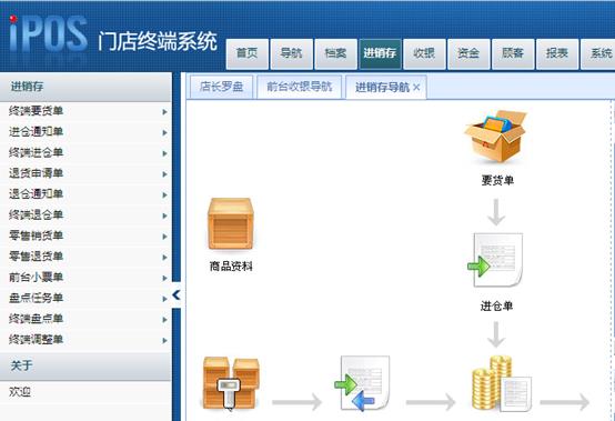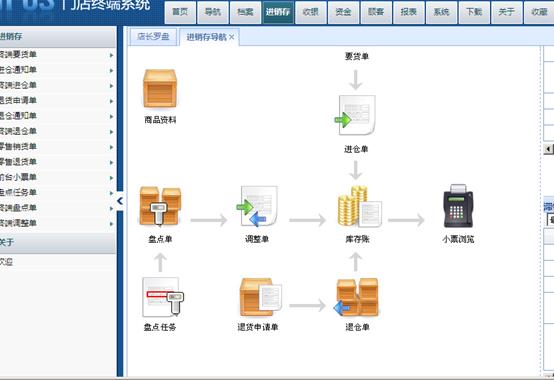 第一步:点击进销存按钮(红圈),打开进销存导航页面